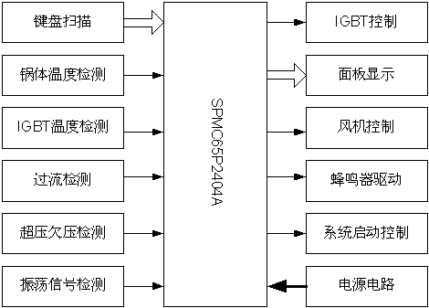 系統(tǒng)采用SPMC65P2404A 作為主控MCU,主要模式有:鍵盤掃描,鍋體溫度檢測(cè),IGBT