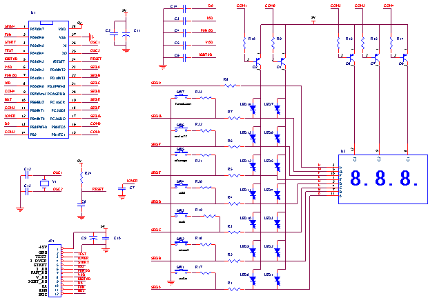 主控板電路如圖5-7所示。主控板主要由MCU、數(shù)碼管、發(fā)光二極管、按鍵、復(fù)位電路組成,數(shù)碼管采用共陽(yáng)型的,發(fā)光二極管驅(qū)動(dòng)方法為動(dòng)態(tài)掃描,按鍵與SEG 線復(fù)用,控制COM 口,回讀SEG 數(shù)據(jù)的I/O 來(lái)掃描按鍵。復(fù)位電路為低電壓復(fù)位電路,當(dāng)電壓低于2.6V 時(shí),系統(tǒng)產(chǎn)生復(fù)位。
