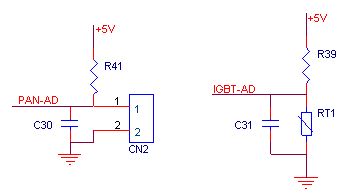 溫度測(cè)量電路如圖5-5所示。通過(guò)兩個(gè)熱敏電阻分別來(lái)測(cè)試IGBT 和瓷磚底面的溫度,以此來(lái)保護(hù)IGBT,和對(duì)系統(tǒng)進(jìn)行溫度控制時(shí)提供參考。