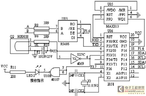 采用AT89C2051單片機(jī)為核心配置,以溫濕度傳感器SHT75、數(shù)碼管顯示、計(jì)算機(jī)監(jiān)控系統(tǒng)等部件,通過單片機(jī)與智能傳感器相連,采集并存儲(chǔ)智能傳感器的測(cè)量數(shù)據(jù),并通過RS485總線來實(shí)現(xiàn)PC上位機(jī)