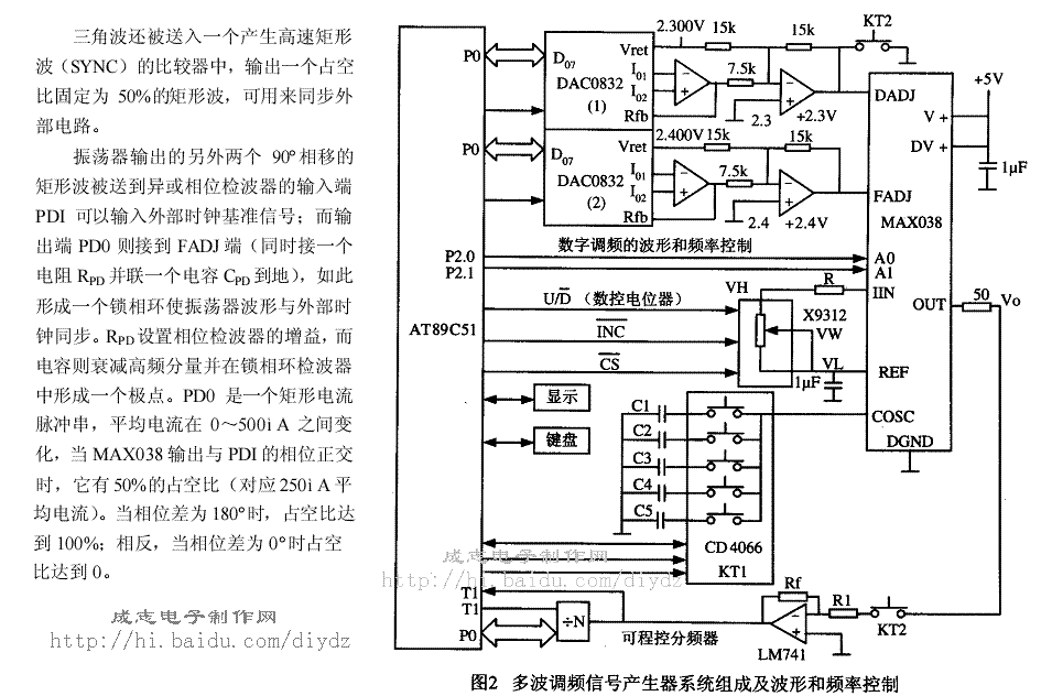 正弦波產(chǎn)生電路 正弦波( 控制信號(hào))產(chǎn)生電路由單片機(jī)AT89C51、MAx038、DAC0832構(gòu)成,如圖2所示。A飛9C51的幾。和P::控制選定基頻和波形,DAC0832相應(yīng)