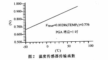 AMUX中的8個通道用于外部測量,而第9通道在內(nèi)部被接到片內(nèi)溫度傳感器(溫度傳輸函數(shù)如圖2所示)。?