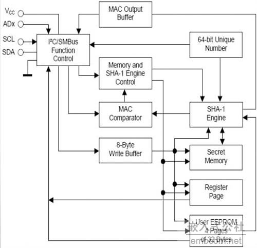 帶EEPROM的SHA-1 協(xié)處理器DS2460 是ISO/IEC10118-3 安全散列算法(SHA-1)的硬件實施方案,無需開發(fā)執(zhí)行復(fù)雜SHA計算的軟件,即可鑒別SHA器件以及驗證數(shù)字簽名服務(wù)數(shù)據(jù)的有效性。DS2460