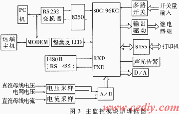獨(dú)立的模塊,可監(jiān)控整個(gè)電源系統(tǒng)的工作狀態(tài),控制各模塊的投入和退出,完成人機(jī)對話,實(shí)現(xiàn)與外部PC或遠(yuǎn)端主機(jī)的通信?! D3是該模塊的原理框圖。系統(tǒng)采用Intel公司的80C196KC作主控制器,用本身