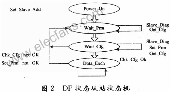 圖2為DP從站狀態(tài)機(jī)的簡(jiǎn)單圖示。各種橢圓表示不同的狀態(tài),帶箭頭的連線表示狀態(tài)間的轉(zhuǎn)換,連線上的文字表示狀態(tài)轉(zhuǎn)換所需滿足的條件。