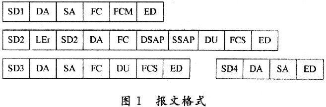 Profibus-DP數(shù)據(jù)編碼采用異步不歸零制,傳輸線的空載電平為“1”。為了避免數(shù)據(jù)傳輸中發(fā)生沖突而導(dǎo)致數(shù)據(jù)丟失,在每個(gè)請(qǐng)求報(bào)文發(fā)送前必須保證33位(同步時(shí)間)的空載狀態(tài)。在單個(gè)字符間所有數(shù)據(jù)傳送時(shí)沒有間隙,即無縫。各種報(bào)文的格式如圖1所示。