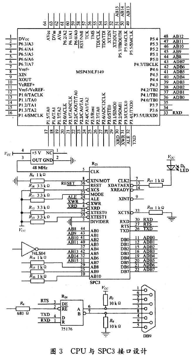 考慮到Profibus對(duì)速率的要求本文選用高速率,低功耗的16位MSP430單片機(jī),采用Intel工作方式。CPU與SPC3接口電路如圖3所示。對(duì)于MSP430單片機(jī)而言,SPC3相當(dāng)于它擴(kuò)張的一個(gè)外部RAM。單片機(jī)可以通過訪問外部RAM的方法訪問SPC3的寄存器。RS 485驅(qū)動(dòng)器的一端與SPC3相連,另一端通過9針D型插頭與總線相連。RS 485驅(qū)動(dòng)器選擇SN75SLS176來滿足高速的數(shù)據(jù)通信。