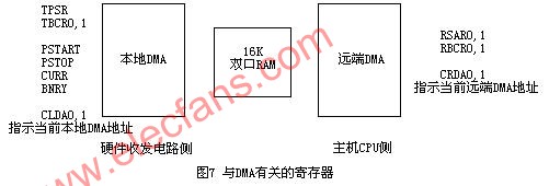 何謂本地/遠(yuǎn)端DMA呢?如圖7所示,“遠(yuǎn)端”指CPU接口側(cè);“本地”指8019的硬件收發(fā)電路側(cè)。沒有更深的意思,與遠(yuǎn)近無關(guān),僅僅為了區(qū)分主機(jī)和芯片硬件兩個(gè)接口端。這里的DMA與平時(shí)所說的DMA有點(diǎn)不同。RTL8019AS的local DMA操作是由控制器本身完成的,而其remote DMA并不是在無主處理器的參與下,數(shù)據(jù)能自動移到主處理器的內(nèi)存中。remote DMA指主機(jī)CPU給出起址和長度就可以讀寫芯片RAM,每操作一次RAM地址自動加1。而普通RAM操作每次要先發(fā)地址再處理數(shù)據(jù),速度較慢。