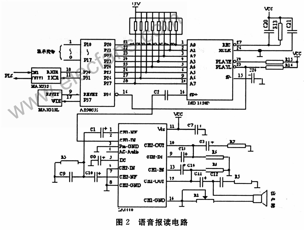 在現(xiàn)代大多控制系統(tǒng)中,通常使用發(fā)光二極管LED、數(shù)碼管、液晶顯示器、蜂鳴器等進行狀態(tài)/結(jié)果顯示和故障報警,如果在顯示報警儀表上采用數(shù)字語言技術(shù),使適合用聽覺傳送的信息用語言傳送,就可以發(fā)揮聽覺的優(yōu)勢,彌補完全用視覺信號傳遞信息的不足。近年來隨著語音電路的迅速發(fā)展,語音芯片已經(jīng)以其直觀、生動、與單片機接口方便等優(yōu)勢,越來越廣泛的應(yīng)用于單片機控制系統(tǒng)中了,成為現(xiàn)代控制系統(tǒng)中人機聯(lián)系的一個友好界面。