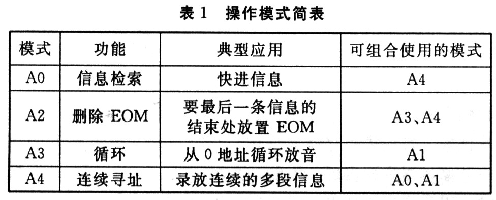 (2)當PLAYL、PLAYE或REC變?yōu)榈碗娖剑瑫rA6,A7為高電平時,執(zhí)行對應(yīng)操作模式。這種操作模式一直執(zhí)行到下一個低電平控制輸入信號出現(xiàn)為止,這一刻現(xiàn)行的地址/模式信號被取樣并執(zhí)行。操作模式可以與微控制器一起使用,也可用硬件連線得到所需系統(tǒng)操作。