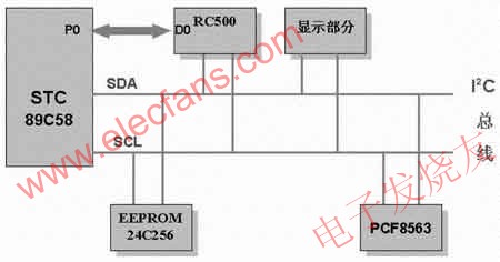 消費(fèi)機(jī)硬件結(jié)構(gòu)框圖如圖1所示,微控制器STC89C58負(fù)責(zé)整個(gè)窗口機(jī)的監(jiān)控。RC50為MIFARE卡讀寫(xiě)器模塊,在MCU控制下,完成對(duì)卡片的非接觸式讀寫(xiě)等多種操作。PCF8563是一款低功耗的實(shí)時(shí)時(shí)鐘/日歷芯片,實(shí)現(xiàn)時(shí)鐘模塊的計(jì)時(shí)功能。EEPROM模塊用于在脫網(wǎng)消費(fèi)時(shí)保存大量的消費(fèi)記錄。