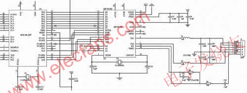 IC卡讀寫(xiě)器的電路如圖2所示,由于采用了PHILIPS公司高集成度的TYPE A讀寫(xiě)器芯片MF RC500,天線驅(qū)動(dòng)電路僅需很少的外圍元件,有效距離可達(dá)10cm。每次上電或硬啟動(dòng)后,芯片會(huì)復(fù)原其并行接口模式并檢測(cè)當(dāng)前的MCU接口類(lèi)型,MF RC500可支持不同的微控制器接口,一個(gè)智能的自動(dòng)檢測(cè)邏輯可以自動(dòng)適應(yīng)系統(tǒng)總線的并行接口,使用信號(hào)NCS選擇芯片。要使用獨(dú)立的地址和數(shù)據(jù)總線與微控制器相連,必須將ALE引腳連接到DVDD。本設(shè)計(jì)使用復(fù)用的地址和數(shù)據(jù)總線與微控制器接口,所以必須將MF RC500的ALE引腳連接到微控制器的ALE信號(hào)。