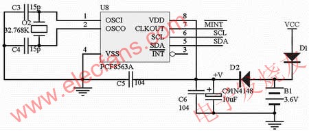 計(jì)時(shí)模塊的電路如圖4所示。PCF8563是低功耗的CMOS 實(shí)時(shí)時(shí)鐘/日歷芯片,它提供一個(gè)可編程時(shí)鐘輸出,一個(gè)中斷輸出和掉電檢測(cè)器,所有的地址和數(shù)據(jù)通過(guò)I2C總線接口串行傳遞。在給PCF8563送入初始的日歷信息后,PCF8563中的日歷就會(huì)自動(dòng)運(yùn)行。由于PCF8563為實(shí)時(shí)時(shí)鐘芯片,在沒(méi)有外接電源時(shí)仍然要求連續(xù)供電,以保持時(shí)間的準(zhǔn)確無(wú)誤。因此,這部分電路還加了掉電保護(hù)功能,在主供電系統(tǒng)意外斷電時(shí),即Vcc為0V時(shí),D1截止,3.6V備用電源通過(guò)D2繼續(xù)給PCF8563供電,保證其正常運(yùn)行。