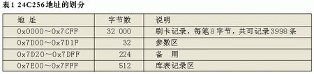 計(jì)時(shí)消費(fèi)機(jī)中存儲(chǔ)的消費(fèi)數(shù)據(jù)要求掉電不丟失,為此選用了ATMEL公司的24C256 EEPROM。24C256是一個(gè)256kb的支持I2C總線數(shù)據(jù)傳送協(xié)議的串行CMOS EEPROM,可編程自定時(shí)寫(xiě)周期(包括自動(dòng)擦除時(shí)間不超過(guò)10ms,典型時(shí)間為5ms),其地址分配如表1所示。