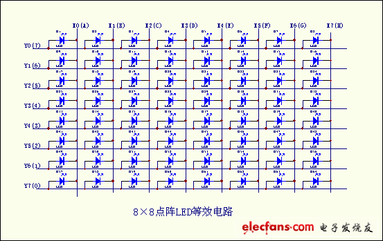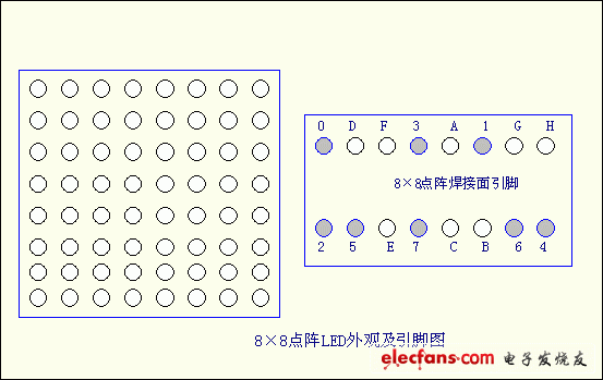 圖(1)為8×8點(diǎn)陣LED外觀及引腳圖,其等效電路如圖(2)所示,只要其對(duì)應(yīng)