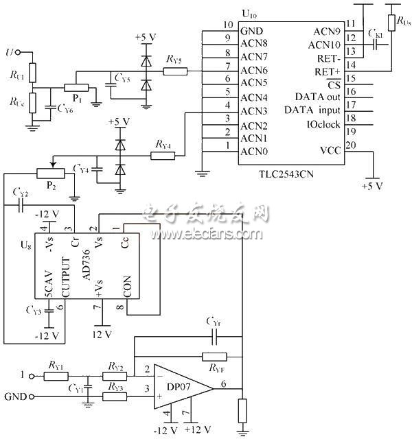 在圖5 電路中,模/ 數(shù)轉(zhuǎn)換器選用的是T I 公司12 位逐次逼近式芯片T LC2543,其帶有采樣保持,串行三態(tài)輸出等功能,在儀器儀表中有較為廣泛的應(yīng)用。電流采樣電路應(yīng)用了真有效值轉(zhuǎn)換芯片AD736,簡(jiǎn)化了軟件設(shè)計(jì)。主電路輸出的電流電壓信號(hào)經(jīng)A/ D 轉(zhuǎn)換后送入單片機(jī)U20 ,單片機(jī)再根據(jù)偏差值修改控制量以及實(shí)現(xiàn)過(guò)壓過(guò)流保護(hù)、故障判斷等功能。