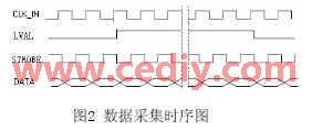 在數(shù)據(jù)的采集過程中,數(shù)據(jù)傳送的同步信號(hào)由 STROBE引腳產(chǎn)生,當(dāng)數(shù)據(jù)在一個(gè)數(shù)據(jù)區(qū)存滿時(shí),通過LVAL引腳通知FPGA 轉(zhuǎn)到另一數(shù)據(jù)存儲(chǔ)區(qū)。圖2 給出了數(shù)據(jù)采集的時(shí)序圖。其中CLK_IN是由FPGA的內(nèi)核數(shù)字時(shí)鐘管理模塊DCM 來實(shí)現(xiàn)倍頻得到。在時(shí)鐘控制和管理方面DCM比DLL功能更強(qiáng)大,使用更靈活。DCM的主要功能包括消除時(shí)鐘時(shí)延、頻率綜合和時(shí)鐘相位的調(diào)整。在本設(shè)計(jì)中對(duì)輸入時(shí)鐘STROBE作8倍頻處理,以實(shí)現(xiàn)數(shù)據(jù)一轉(zhuǎn)八串并轉(zhuǎn)換的鎖存輸出。