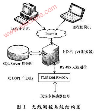 如圖1所示,雙DSP作為下位機實現(xiàn)雙余度A/D采樣轉(zhuǎn)換,并可提高數(shù)據(jù)處理效率。通過RS 485通信接口標(biāo)準(zhǔn)以無線通信方式與上位機進行通信,上位機基于VI技術(shù)和可編程數(shù)據(jù)庫SQL Server技術(shù),實現(xiàn)信號的進一步分析處理或故障診斷、控制功能等,并可進一步擴展測控系統(tǒng),將虛擬儀器技術(shù)和面向Internet的Web技術(shù)有機結(jié)合起來,可以滿足監(jiān)測系統(tǒng)的互聯(lián)和資源共享的需求。