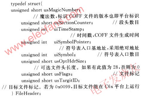 在此討論的方法基于對(duì)COFF文件結(jié)構(gòu)的分析,讀取DSP編譯器生成的.out文件,根據(jù)文件本身攜帶的信息,直接提取生成可供下載的二進(jìn)制文件。最終生成的二進(jìn)制文件中包含有與.out文件相同的信息,在下載時(shí)利用這些信息即可完成對(duì)DSP芯片的加載。