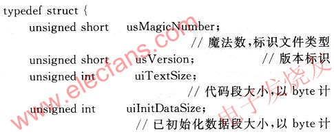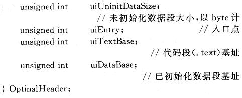 (2)可選頭:可選頭接在文件頭的后面,也就是從COFF文件的Ox0014偏移處開(kāi)始。長(zhǎng)度可以為O。不同平臺(tái)的可選頭,長(zhǎng)度和結(jié)構(gòu)都不相同,TI DSP采用的可選頭長(zhǎng)度為28 B,用C的結(jié)構(gòu)描述如下: