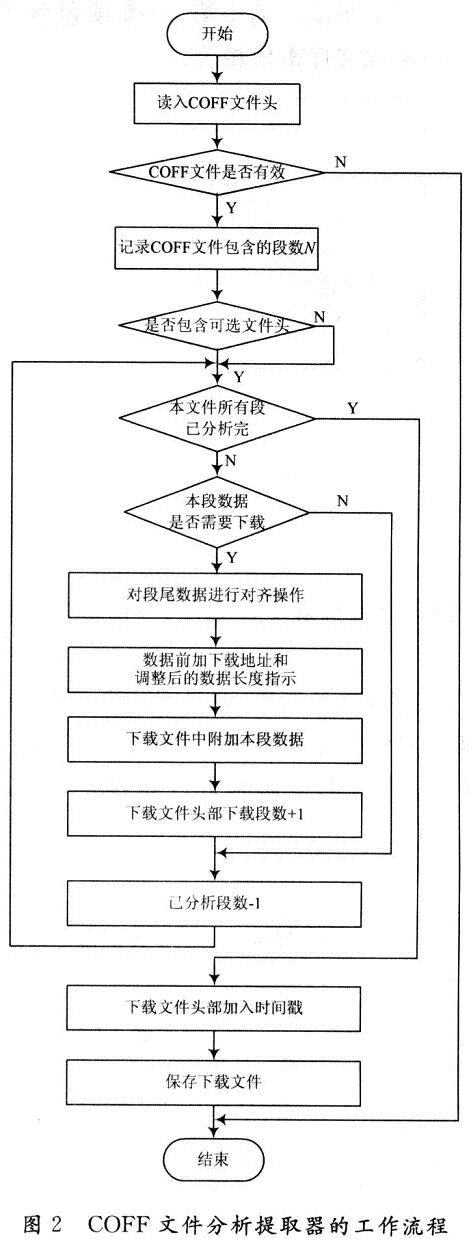 首先讀入目標(biāo)文件,該文件擴(kuò)展名為out,以二進(jìn)制形式讀入。分析.out文件的文件頭以確定有多少個(gè)段,然后逐段分析段信息頭,根據(jù)段屬性標(biāo)識(shí)以確定是否需要下載,段頭中的絕對(duì)地址、段數(shù)據(jù)長(zhǎng)度等信息作為升級(jí)文件的一部分。與需下載的段數(shù)據(jù)合并成最終的下載文件,為了適應(yīng)自動(dòng)化升級(jí)的需要,下載文件頭部還保留了COFF文件的時(shí)戳。值得注意的是因?yàn)門(mén)MS320C6000 DSP為32位處理器,需要對(duì)段落頭中段數(shù)據(jù)長(zhǎng)度信息進(jìn)行32位整型對(duì)齊,在此采用Ceil對(duì)齊——不足的字節(jié)以O(shè)補(bǔ)齊。具體流程如圖2所示。