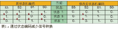讓我們來看一個(gè)在狀態(tài) 7 和狀態(tài) 8 之間頻繁進(jìn)行狀態(tài)轉(zhuǎn)換的狀態(tài)機(jī)。如果您為該狀態(tài)機(jī)選擇二進(jìn)制編碼,將意味著對(duì)于每次狀態(tài) 7 和狀態(tài) 8 之間的狀態(tài)轉(zhuǎn)換,將有四位需要改變狀態(tài),如表 1 所示。如果狀態(tài)機(jī)采用格雷碼而不是二進(jìn)制碼來設(shè)計(jì),則這兩個(gè)狀態(tài)之間的轉(zhuǎn)移所需的邏輯轉(zhuǎn)換的數(shù)量將降至僅一位。另外,如果將狀態(tài) 7 和 8 分別編碼為 0010 和 0011,也可以達(dá)到同樣的效果。