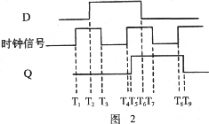 Table文件的構(gòu)成與向量文件大致相同。它的開始部分是注釋(同樣是以%…%標(biāo)注的文字),接著是對輸入/輸出信號、時間單位、顯示采用進(jìn)制的定義,第三部分就是對輸入/輸出信號在仿真后的列表。其中,“>”號以前的是時間值,“=”號后面則是我們關(guān)心的仿真輸出結(jié)果了。根據(jù)Table文件的這些特點,我們可以編制MATLAB函數(shù)將關(guān)心的東西(如時間值、某輸出結(jié)果)提取出來形成數(shù)據(jù)序列,以便后續(xù)處理。在這里要注意一個問題,就是Table文件中會對每一個信號的變化時刻都進(jìn)行記錄,我們用圖2的一個簡單的D觸發(fā)器的部分仿真時序來作說明,圖中示出了D觸發(fā)器的輸入信號D、時鐘,以及其輸出信號Q,在這一段仿真中,Table文件會記錄從T1~T9的9個信號變化的時刻,這使得輸出信號的每一個值被記錄了多次。如果我們對此不加甄別就照單全收的話,就會對此后的分析工作帶來麻煩。因此,對于同步數(shù)字系統(tǒng),我們只應(yīng)提取那些我們關(guān)心的時鐘上沿/下沿時刻的輸出值。