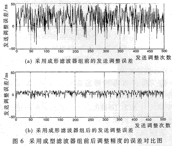 經(jīng)圖中的數(shù)據(jù)計(jì)算得出:在不采用成型濾波器組的情況下,發(fā)送調(diào)整誤差的標(biāo)準(zhǔn)差為18.17ns。采用成型濾波器組后,發(fā)送調(diào)整誤差的標(biāo)準(zhǔn)為4.42ns,是不采用成型濾波器組時(shí)的4.42ns/18.7ns=24.33%。