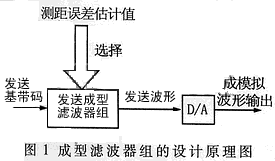 成型濾波器組的設(shè)計(jì)原理圖如圖1所示。成型濾波器組包括一組成型濾波器。相同的發(fā)送基帶碼經(jīng)成型濾波器組中不同的成型濾波器濾波后,會產(chǎn)生不同延時(shí)的發(fā)送數(shù)據(jù)波形。發(fā)送數(shù)據(jù)波形的延時(shí)不同,則發(fā)送時(shí)刻也不同。這就是說,相同的基帶碼經(jīng)過不同的成型濾波器濾波后可產(chǎn)生不同發(fā)送時(shí)刻的波形。因此,以測距誤差作為選擇字,根據(jù)誤差的大小選擇相應(yīng)的成型濾波器,就可間接地調(diào)整發(fā)送基帶碼的時(shí)刻。