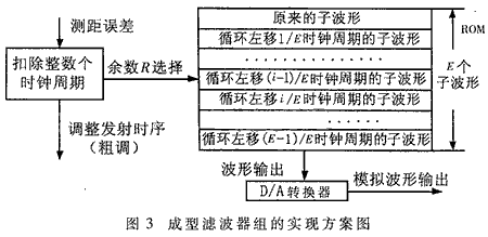 各移位后的子波形按循環(huán)左移大小依次存儲在ROM中。因此一個(gè)時(shí)鐘周期的延時(shí)被劃分成了E個(gè)區(qū)間,將測距誤差除以時(shí)鐘周期,得到余數(shù)R,計(jì)算出R落在了E個(gè)區(qū)間中的哪個(gè)。選擇該區(qū)間的子波形,將該子波形送到調(diào)整步長降到時(shí)鐘周期的1/E。實(shí)際設(shè)計(jì)時(shí),在MATLAB中將FIR濾波器的沖激響應(yīng)以時(shí)鐘周期的1/E循環(huán)左移,再與插零后的基帶碼卷積,就實(shí)現(xiàn)了子波形的循環(huán)左移。再通常的系統(tǒng)實(shí)時(shí)產(chǎn)生的濾波是則系統(tǒng)時(shí)鐘控制的,延時(shí)不會小于一個(gè)時(shí)鐘周期,因此其調(diào)整精度遠(yuǎn)不如用MATLAB設(shè)計(jì)的成型濾波器組的方法。