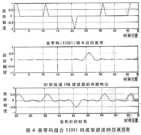 本設(shè)計(jì)所應(yīng)用的測距系統(tǒng)的基帶碼速率為2MHz,系統(tǒng)時(shí)鐘頻率為20MHz,因此在2MHz基帶碼的相鄰比特間內(nèi)插20/2-1=9個(gè)“0”,然后通過(5×20)/2=50階(C選為5)的FIR濾波器就可實(shí)現(xiàn)成型濾波。5個(gè)基帶碼可排列成32種組合,圖4是其中的一種基帶碼組合——11011的成型濾波的仿真結(jié)果。圖中顯示了該組合插零后與成型濾波器的沖激響應(yīng)進(jìn)行卷積的過程??梢钥闯觯矸e的中間10點(diǎn)數(shù)據(jù)波形正好是插零前5個(gè)基帶碼中間的信號0經(jīng)濾波器平滑后的波形。這10點(diǎn)數(shù)據(jù)波形存在11011為基地址的ROM中。