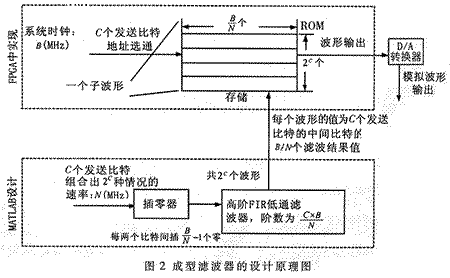 通常,系統(tǒng)時(shí)鐘頻率遠(yuǎn)高于基帶碼的速率,因此在成型濾波前,要在基帶碼的相鄰碼之間進(jìn)行內(nèi)插。內(nèi)插的方式有多種,通常的內(nèi)插方法是在發(fā)送的基帶碼的相鄰碼之間內(nèi)插“0”。將基帶碼插“0”后,與低通濾波器的沖激響應(yīng)卷積,再送到D/A轉(zhuǎn)換器轉(zhuǎn)換成模擬濾波器就可以實(shí)現(xiàn)濾波成型。設(shè)計(jì)低通濾波器時(shí),為了得到較好的波形,通常采用高階的FIR濾波器。如果在FPGA中用邏輯單元實(shí)現(xiàn)高階FIR濾波器,全占用大量的邏輯單元。比如在 Altera 公司的FPGA中用邏輯單元實(shí)現(xiàn)一個(gè)50階的FIR濾波器,需要26個(gè)乘法器和50個(gè)加法器,要占用一千多個(gè)邏輯單元。而本文利用FPGA中的ROM,用查表的方法設(shè)計(jì)同樣的FIR濾波器,則只需占用幾十個(gè)邏輯單元。圖2是成型濾波器的設(shè)計(jì)原理圖。該設(shè)計(jì)包括用數(shù)學(xué)工具——MATLAB預(yù)先設(shè)計(jì)的部分和在FPGA中實(shí)現(xiàn)的部分,MATLAB完成成型濾波后的數(shù)據(jù)波形文件的設(shè)計(jì)。FPGA存儲設(shè)計(jì)好的數(shù)據(jù)波形文件,并用發(fā)送的基帶碼選通相應(yīng)波形的存儲地址,完成濾波成型。