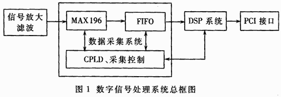 數(shù)據(jù)采集系統(tǒng)是基于DSP的信號(hào)處理系統(tǒng)中的一部分??驁D如圖1所示。該數(shù)字信號(hào)處理系統(tǒng)用于隨機(jī)共振理論在弱信號(hào)檢測(cè)中的應(yīng)用研究中。整個(gè)系統(tǒng)由信號(hào)放大、信號(hào)濾波、信號(hào)采樣、高速數(shù)字信號(hào)處理、與主計(jì)算機(jī)的高速數(shù)據(jù)傳輸接口等部分組成。其中,信號(hào)放大是對(duì)輸入信號(hào)進(jìn)行調(diào)理 以滿(mǎn)足采樣的要求;信號(hào)濾波是防止信號(hào)產(chǎn)生“混疊現(xiàn)象”;信號(hào)采樣是完成模擬信號(hào)的數(shù)字化;高速數(shù)字信號(hào)處理是在建立隨機(jī)共振模型的基礎(chǔ)上完成各種算法;與主計(jì)算機(jī)的高速數(shù)據(jù)傳輸接口是滿(mǎn)足信號(hào)檢測(cè)的實(shí)時(shí)性,將DSP處理的數(shù)據(jù)傳給計(jì)算機(jī)以進(jìn)行進(jìn)一步的處理。