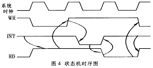 狀態(tài)機(jī)(FSM)完成自動(dòng)A/D轉(zhuǎn)換和數(shù)據(jù)存儲(chǔ),控制芯片是EPM7128SQC100。該狀態(tài)機(jī)由系統(tǒng)時(shí)鐘驅(qū)動(dòng),產(chǎn)生RD、WR、INT信號(hào),狀態(tài)機(jī)能連續(xù)運(yùn)行,不斷地寫(xiě)命令字以啟動(dòng)A/D轉(zhuǎn)換,然后讀出A/D的轉(zhuǎn)換結(jié)果并同時(shí)寫(xiě)入FIFO。時(shí)序圖見(jiàn)圖4。