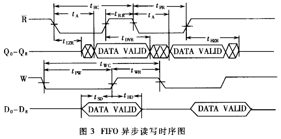 系統(tǒng)采集的數(shù)據(jù)常常放在數(shù)據(jù)緩存器中。數(shù)據(jù)緩存區(qū)要求既要有與A/D芯片的接口,又要有與系統(tǒng)DSP的接口以提高數(shù)據(jù)吞吐率,因此常選用雙口RAM或FIFO。由于FIFO不需要地址尋址,為了簡(jiǎn)化控制信號(hào),本模塊采用FIFO芯片CY7C425作為數(shù)據(jù)緩存區(qū)。FIFO存儲(chǔ)器允許數(shù)據(jù)寫(xiě)入和讀出不依賴(lài)于數(shù)據(jù)速率,并且總是以寫(xiě)入的順序讀出。根據(jù)Full和Empty標(biāo)志來(lái)判斷存儲(chǔ)器全滿(mǎn)或空。FIFO芯片可以進(jìn)行數(shù)據(jù)寬度和存儲(chǔ)深度的擴(kuò)展而不會(huì)增加額外的時(shí)間延遲。當(dāng)寫(xiě)信號(hào)(W)為低電平時(shí)發(fā)和寫(xiě)操作,當(dāng)讀信號(hào)(R)為低電平時(shí)發(fā)生讀操作。A/D轉(zhuǎn)換的結(jié)果通過(guò)寫(xiě)操作不斷存入FIFO中,當(dāng)FIFO滿(mǎn)時(shí),F(xiàn)ull標(biāo)志有效,向系統(tǒng)申請(qǐng)中斷,DSP響應(yīng)中斷,立即啟動(dòng)DMA讀FIFO中的數(shù)據(jù),當(dāng)讀到空時(shí),Empty標(biāo)志有效,DSP停止讀入操作。采用兩片CY7C425擴(kuò)展為18位1024字的高速異步FIFO存儲(chǔ)器,數(shù)據(jù)處理速度達(dá)到50MHz,可以實(shí)現(xiàn)數(shù)據(jù)的高速寫(xiě)入和高速讀出。FIFO異步讀寫(xiě)時(shí)序見(jiàn)圖3。