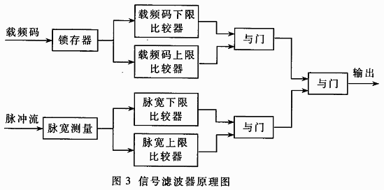各種電子對抗設(shè)備數(shù)目的急劇增加使雷達導引頭系統(tǒng)處于高度密集的信號環(huán)境中,脈沖重復(fù)頻率跟蹤器的實時性受到考驗?;谝陨峡紤],在跟蹤器的前端設(shè)計了信號濾波器,對信號脈沖流進行稀釋,減輕跟蹤器的壓力。信號濾波器的原理圖如圖3所示。