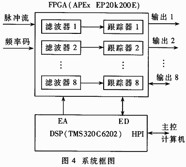 系統(tǒng)框圖如圖4所示,整個系統(tǒng)由DSP和FPGA組成,在 FPGA中設(shè)計了8路跟蹤器,最多可同時對8路信號進行跟蹤。DSP負責控制各路跟蹤器的工作,包括對各路跟蹤器裝載參數(shù)和使能,同時通過HPI(上位機接口)與彈上主控計算機傳遞數(shù)據(jù)。