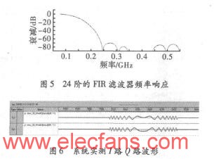 在整個正交相干檢波過程中, 除了ADC的量化影響外, 整個正交檢波系統(tǒng)的性能, 由低通濾波器的設(shè)計決定。由于鏡頻分量處于濾波器的阻帶, 因而阻帶衰減決定了鏡頻的抑制程度。文中采用的低通濾波器為24階F IR濾波器, 其阻帶衰減> 70 dB鏡頻分量得到了較好的抑制 。24階FIR濾波器的頻率特性, 如圖5所示。