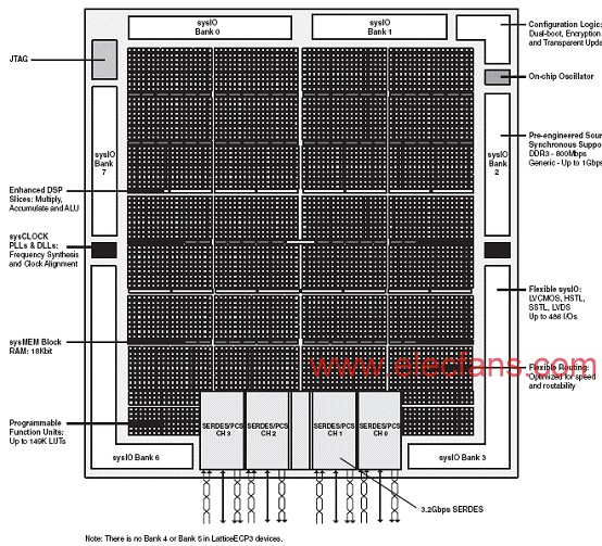 LatticeECP3 (經(jīng)濟(jì)型加第三代)FPGA設(shè)備系列經(jīng)過優(yōu)化,以在經(jīng)濟(jì)的FPGA結(jié)構(gòu)中提供高性能功能,如增強(qiáng)的DSP架構(gòu)、高速SERDES和高速源同步接口。這種結(jié)合是通過器件結(jié)構(gòu)的進(jìn)步