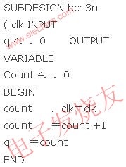 oo0為經(jīng)電平轉(zhuǎn)換后接近開關(guān)輸出的信號。當(dāng)oo0為低電平時,說明泵1未動作,封鎖三端與門,時鐘信號clki無法通過,計數(shù)器bcn3n不計數(shù)。同理,當(dāng)aa4為高電平時,亦封鎖三端與門(至于aa4如何變化及作用下文有介紹)。故當(dāng)oo0為高、aa4為低時,clki接通計數(shù)器CLK端。當(dāng)oo0和clr端任意一個為低時,計數(shù)器清零。計數(shù)器bcn3n由MAX+PLUSII的文本編輯器編輯,其文本如下: