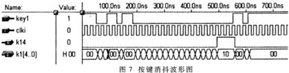 按鍵未按下時為高電平,封鎖時鐘信號。按鍵按下時,計數(shù)器開始計數(shù)。當(dāng)計數(shù)器輸出最高位為"1"時,亦封鎖時鐘信號,防止按鍵時間不定使需要的k14信號不定。當(dāng)按鍵信號為高電平時,對計數(shù)器清零,防止計數(shù)器累加干擾信號而造成誤動作。波形如圖7所示。