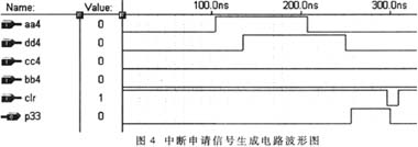 只要有一路信號為高,D觸發(fā)器時鐘端為低。當(dāng)所有4路都為低時,時鐘端由低變高,在上升沿,Q變?yōu)?1",發(fā)出中斷請求信號。