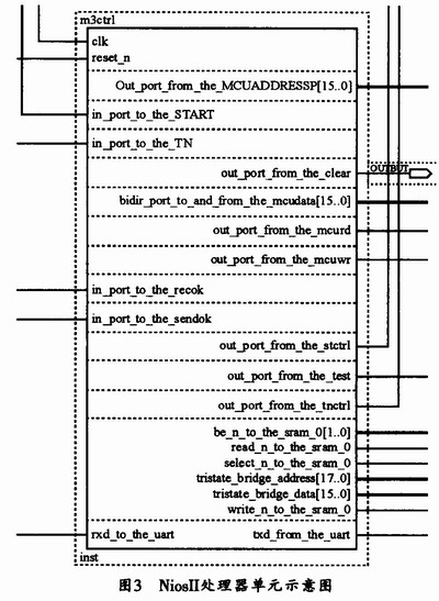 具體工作時(shí),當(dāng)數(shù)據(jù)流向?yàn)镽S422串口到MIII總線時(shí),NIOSII處理器可將數(shù)據(jù)從RS422串口接收緩沖存儲(chǔ)器中讀出,并輸出至MIII總線發(fā)送緩沖單元中,同時(shí)還將數(shù)據(jù)發(fā)送到外部的SRAM中進(jìn)行存儲(chǔ);而當(dāng)數(shù)據(jù)流向?yàn)镸III總線到RS422串口時(shí),其方式其之類似,其不同點(diǎn)是由于MIII總線的傳輸速率遠(yuǎn)大于串口的傳輸速率,因而要插入相應(yīng)的等待和協(xié)調(diào)控制信號(hào)。