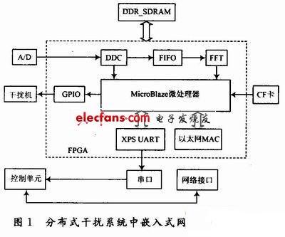 方向。因此,本文在設(shè)計分布式干擾系統(tǒng)的嵌入式網(wǎng)關(guān)時選用基于FPGA的SoPC解決方案,選用的實驗平臺為Xilinx公司的ML402開發(fā)平臺。