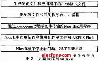 更新FPGA的配置文件和NiosII的應(yīng)用程序的流程如圖2所示。