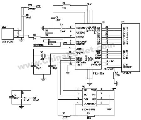 FT245BM芯片自身就可完成數(shù)據(jù)轉(zhuǎn)換,而不需要設(shè)計(jì)者考慮硬件設(shè)計(jì)。其內(nèi)部結(jié)構(gòu)功能如圖1。圖1 FT245BM芯片功能框圖硬件接口設(shè)計(jì)接口電路原理圖見圖2。設(shè)計(jì)采用USB總線供電,圖2中FT245BM與一片