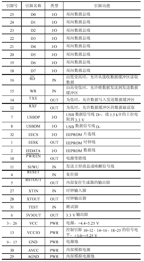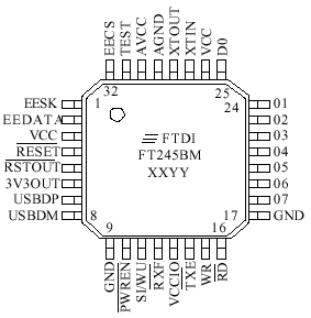 另外,FT245BM還包括1個內(nèi)置的3.3 V的穩(wěn)壓器,1個6 MHz的振蕩器、8倍頻的時鐘倍頻器、USB鎖相環(huán)和EEPROM接口。FT245BM采用32腳的PQFP封裝,體積小巧,易于和外設做到一塊板上。其外形及引腳分布如圖2所示,各引腳的功能描述如表1所列。