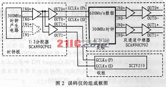 ??? (1)鐘板。時鐘板的SCAN90CP02配置成1:2分配器方式,EN0、EN1、SEL0和SEL1都置為低電平。時鐘板產(chǎn)生的300MHz時鐘信號為LVPECL電平,經(jīng)SCAN90CP02轉(zhuǎn)換成2路LVDS電平,分別送往誤碼儀的發(fā)板和收板。