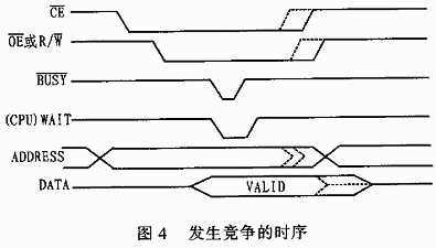 另外,在使用BUSY信號時必須首先將此信號接上拉電阻,其次應(yīng)在BUSY信號有效期間使處理器保持讀寫操作經(jīng)及相應(yīng)的地址和數(shù)據(jù),但是需要說明的是:在BUSY信號變高之前,這種情況下的所有寫操作都是無效的,圖4所示發(fā)生競爭時的時序圖。