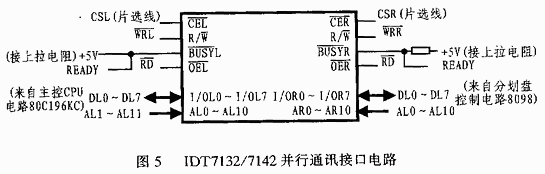 雷達(dá)仿真平臺是用于雷達(dá)操作手訓(xùn)練的仿真設(shè)備。該平是一個由計算機(jī)、主控CPU(80C196KC)、手輪控制CPU(8098)等組成的多機(jī)系統(tǒng)。在主控CPU判斷目標(biāo)是否進(jìn)入雷達(dá)波瓣作用范圍時,必須將目標(biāo)理想諸元與雷達(dá)的高低角和方位角做比較。在雷達(dá)仿真平臺中,雷達(dá)的高低角和方位角是通過對高低手輪和方位手輪的軸角轉(zhuǎn)換而獲得的。主控CPU每隔20ms就向手輪控制CPU發(fā)送一次模擬目標(biāo)的高低角、方位角、距離以及目標(biāo)屬性等多組數(shù)據(jù)(共200字節(jié)),同時接收手輪控制CPU的數(shù)據(jù)。為了加快通迅速度,簡化通訊,提高通信的實(shí)時性指標(biāo),系統(tǒng)要用了雙端口RAM(DPRAM)IDT7132/7142來進(jìn)行CPU之間的數(shù)據(jù)交換。具體電路見圖5。